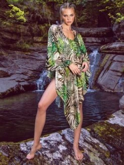 Dieses Strandkleid mit V-Ausschnitt besteht aus einer weichen Polyester Netzspitze mit intensivem Zick Zack Muster in türkisblau, bronze-braun, flieder-lila und gelb. Das Material ist weich und hautschmeichelnd. Das Kleid ist in den Größen 36 bis 42 erhältlich.